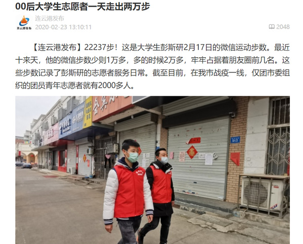 22237步!这是大学生彭斯研2月17日的微信运动步数。最近十来天,他的微信步数少则1万多,多的时候2万多,牢牢占据着朋友圈前几名。这些步数记录了彭斯研的志愿者服务日常。截至目前,在我市战疫一线,仅团市委组织的团员青年志愿者就有2000多人。