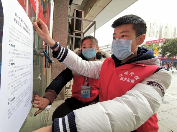 他和搭档一起,在每个单元楼下和店铺门上张贴防疫通告,一家商户门上往往要贴四五张通知。时间紧迫,因为总是需要用手将文件在墙上抹平整,连续两三天下来,彭斯研的手指被磨出了水泡。