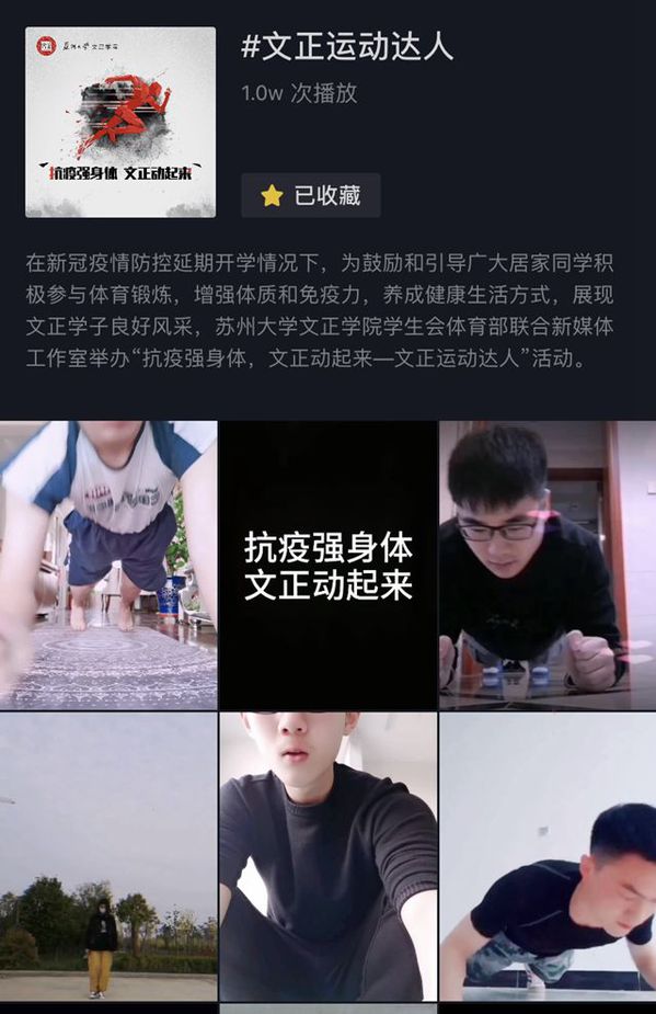 本次活动借助抖音平台开展,通过学院官抖发起“文正运动达人”超级话题,包括“模仿挑战赛”和“运动达人秀”两种参与方式。