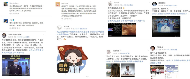 为持续深化“青春共筑防疫长城”主题宣传活动,我院团委于线上推出战“疫”作品成果展示、抗击疫情志愿者先进事迹展示,感悟战“疫”青春力量、凝聚青春正能量;精心组织“优秀共青团员”“优秀共青团干部”“优秀团支部”表彰展示活动,充分发挥青年典型的示范引领作用;积极响应共青团中央“五四精神,传承有我”主题网络活动以及江苏省团省委“新时代江苏青年精神”主题讨论系列活动,于线上通过微信公众号、微博、空间等媒体平台展开网络征文活动、网络话题互动等,增强青年的主人翁意识,促进学生进步成长,倡导文正学子展现新时代中国青年的精神风貌。(文/吴雪娇)