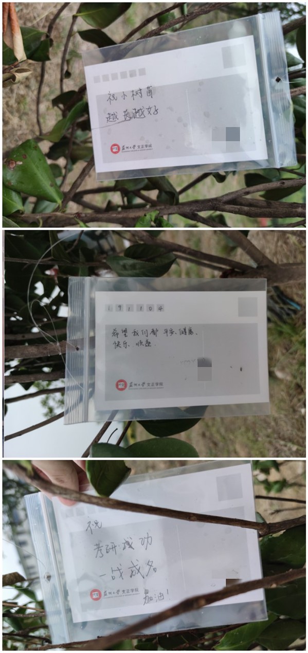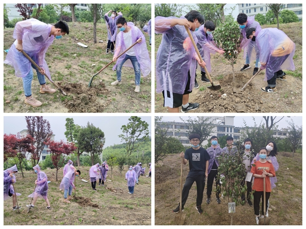 活动开始前,工作人员对参与活动的同学逐个进行体温测量,并将同学分成10组。同学们到指定地点领取铲子、树苗、水桶、一次性雨衣等后前往校友林。植树活动开始,同学们迅速行动起来。过程中同学们相互协作,有的挖地、有的浇水,配合默契,活动现场一片欢声笑语。植树完毕,同学们在明信片上写下心愿并挂在了在自己种下的树上。