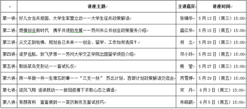 文正“职播间”就业指导课专题讲座是2020届毕业生就业指导专项行动之一,八位嘉宾的分享,涉及征兵政策、创业政策、“三支一扶”、出国留学、面试礼仪、简历制作、心理调适等多个方面,既有政策层面的介绍引领,也有技术层面的展示铺陈,成为应对当前疫情和经济社会严峻形势下就业指导的延伸,通过对毕业生求职指导的分类和细化,有效助力就业知识储备和就业竞争力提升,从而实现更高质量和更充分就业。