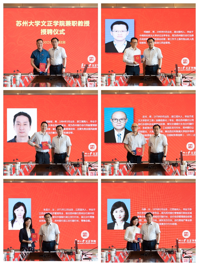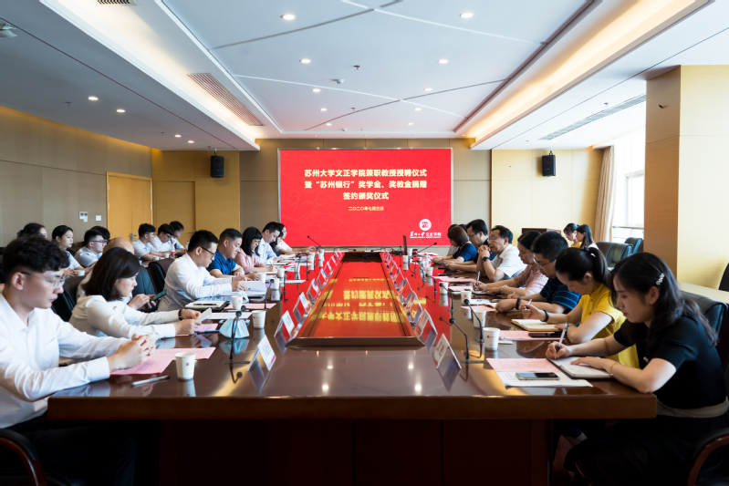 7月3日下午,我院兼职教授授聘仪式暨“苏州银行”奖学金、奖教金捐赠签约颁奖仪式在综合楼三楼大会议室顺利举行。苏州银行人力资源总监钱凌欣先生,苏州银行苏银金融学院院长樊丽恒女士,苏州银行总行法律合规部总经理柯建新先生,苏州银行总行风险管理部副总经理范俊斌先生,苏州银行公司银行总部科创金融部总经理史杰先生,苏州银行吴中区域零售总裁朱亚川女士,苏州银行新区区域零售总裁马静女士,苏州银行总行人力资源部教育培训中心副经理徐侃女士,我院院长吴昌政,副院长施盛威,院长助理、学生工作部部长(兼)卞海勇,人事处处长周文军,学生处处长祁素萍,招生就业处处长宋丹以及“苏州银行”奖学金、奖教金获奖师生参加了此次仪式。仪式由祁素萍主持。