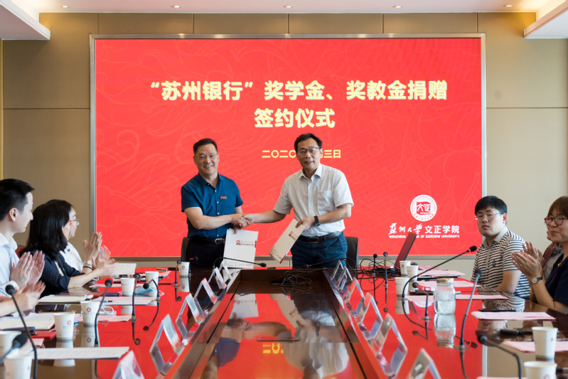 钱凌欣和吴昌政分别代表苏州银行和文正学院签订了苏州大学文正学院“苏州银行”奖学金、奖教金合作协议书。