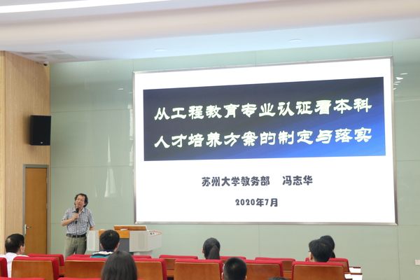 7月7日下午,苏州大学教务部教学质量与资源管理处处长冯志华教授应邀来到我院,结合我院专业建设现状,开展了一场题为“从工程教育专业认证看本科人才培养方案的制定与落实”的专题讲座。学院所有理工科专业教师和教学工作部等职能部门管理人员参加讲座。副院长施盛威主持讲座。