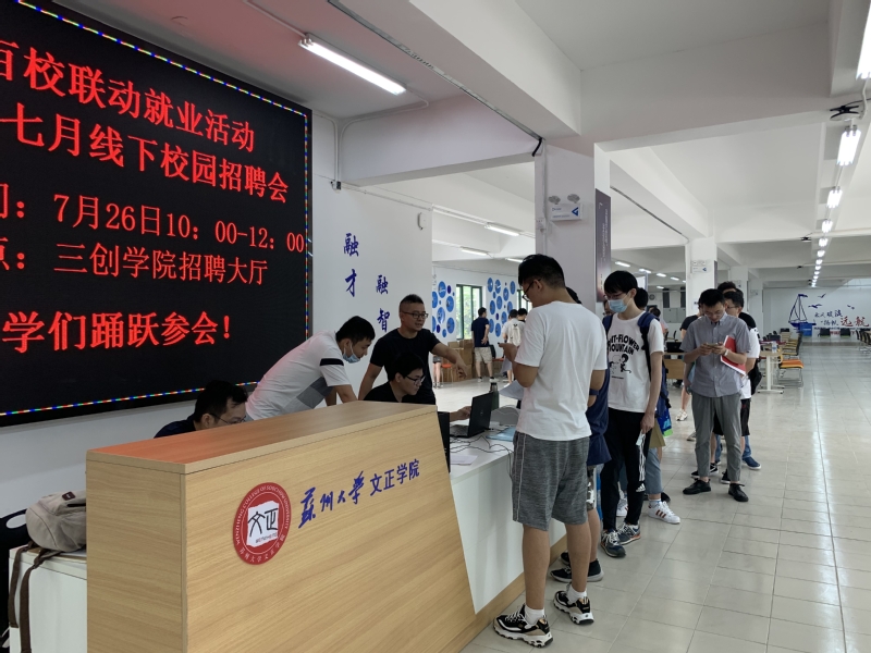 为深入贯彻习近平总书记关于统筹推进新冠肺炎疫情防控和经济社会发展工作的重要讲话和重要指示批示精神,落实上级部门对高校毕业生就业工作的相关要求,促进高校毕业生尽早就业,7月26日,我院在三创学院一楼招聘大厅举办了“江苏省百校联动就业活动暨苏州大学文正学院7月线下校园招聘会”。