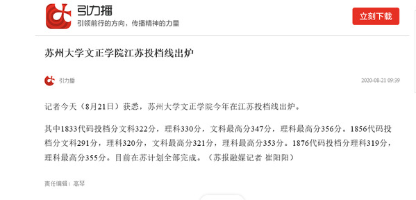 记者今天(8月21日)获悉,苏州大学文正学院今年在江苏投档线出炉。