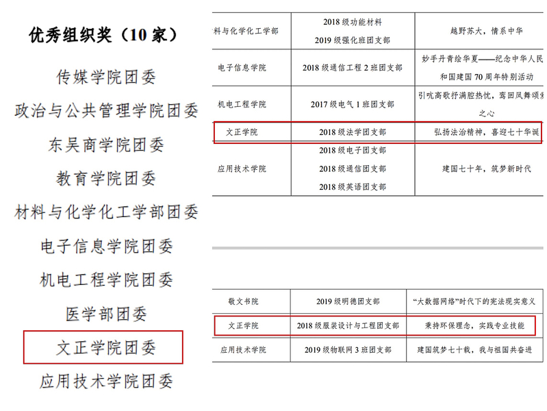 我院团委坚持中心工作,完善思想育人,在传统主题团日活动开展基础上,以“信仰公开课”为契机,全年共开展主题教育活动384场,覆盖全院1-3年级150余个团支部。在2019-2020年度苏州大学第一学期“优秀主题团日活动”评比中,2018级法学团支部“弘扬法治精神,喜迎七十华诞”主题团日荣获“十佳主题团日活动”称号,2018级服装设计与工程团支部“秉持环保理念,实践专业技能”主题团日荣获“优秀主题团日”称号,我院团委荣获优秀组织奖。