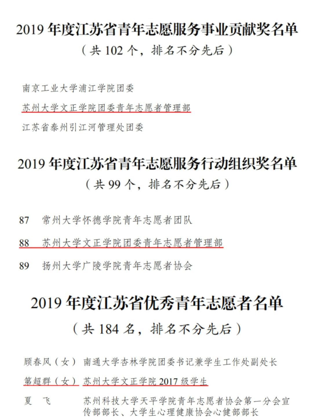江苏省青年志愿服务事业贡献奖、行动组织奖、优秀青年志愿者