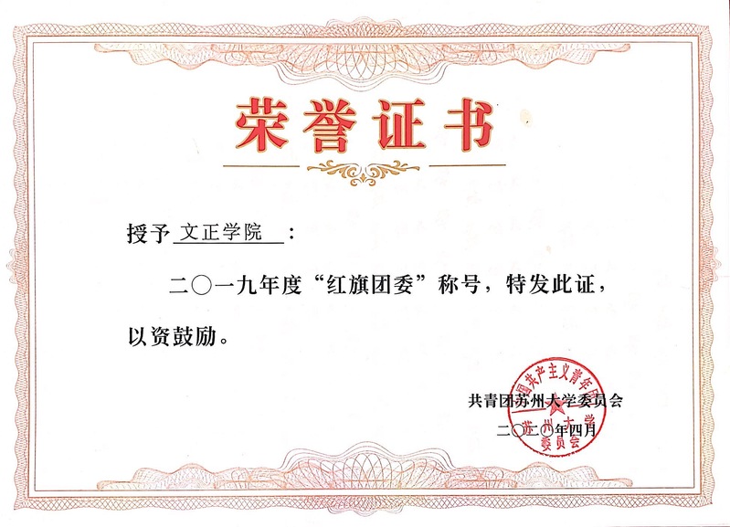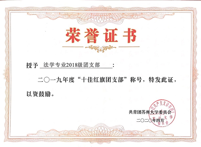 在2019年度苏州大学“红旗团委”“十佳红旗团支部”评比中,我院团委获评“2019年度苏州大学红旗团委”,2018级法学团支部获评“2019年度苏州大学十佳红旗团支部”。 2018 级城市管理团支部等20个团支部获评“红旗团支部”。茅琼丹等24名同学获评“苏州大学优秀共青团干部”称号;符馨等21名同学获评“苏州大学优秀团支部书记”称号。