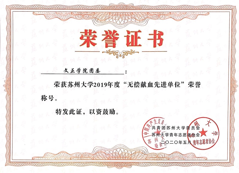 我院团委始终坚持特色项目,打造文正品牌。全年学院参与公益活动超过5000人次,累计时长3.9万小时。全年累计献血量29万毫升。梅飞、孟超然获评“苏州大学无偿献血先进个人”称号;抗击疫情期间,我院学子纷纷加入到社区防疫志愿工作中,涌现了一批抗疫先进青年,许越等5位同学获评2020年“苏州大学抗疫之星”称号,“大爱微行——苏州大学文正学院公益志愿坊”项目获团中央“七彩四点半”立项,我院青年志愿者管理部荣获2019年度苏州轨道交通志愿者联盟先进志愿组织称号、苏州大学 2019 年度优秀青协分会称号,团委荣获苏州大学“无偿献血先进单位”称号。