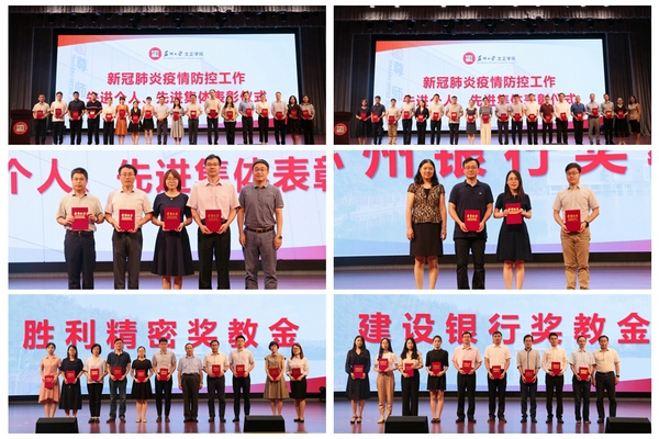 大会对在科研竞赛表现突出的王佳丽老师团队、吴晓华老师团队、吴丹老师团队,获苏州市第十五次哲学社会科学优秀成果奖的陈晓红老师,获得江苏省优秀共青团干部称号的何玉老师,被评为苏州市优秀教育工作者称号的茆萌老师、邢超老师等进行了通报表扬;对在疫情防控工作中积极作为的陈波等38位先进个人、教务处等4个先进集体,对卞海勇等3位“苏州银行”奖教金获得者、于惠等10位“胜利精密”奖教金获得者、朱冬梅等10位“建设银行”奖教金获得者进行了表彰。学院领导为受表彰老师上台颁发荣誉证书。