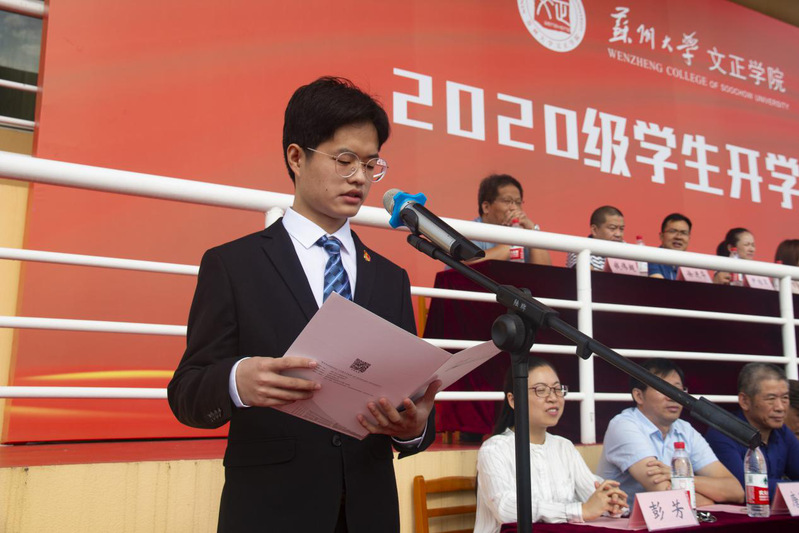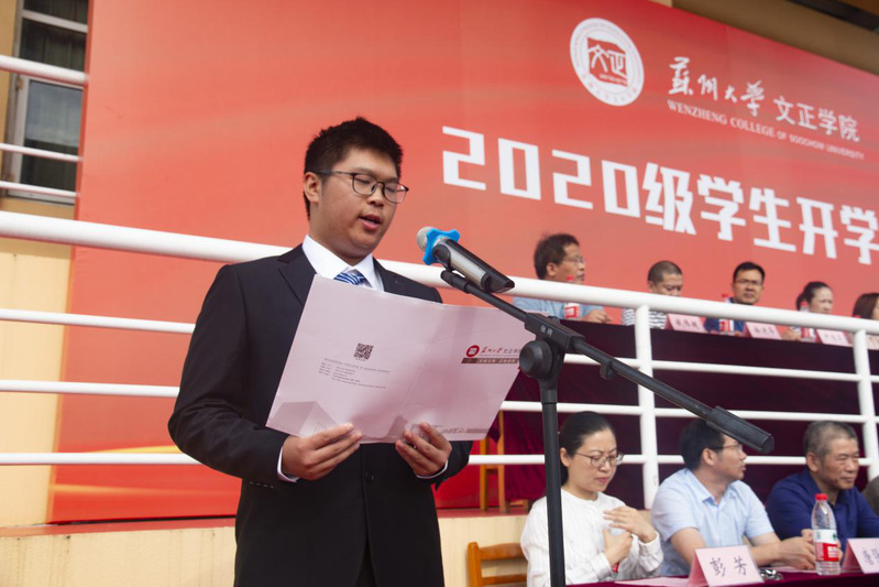 2020级法学专业李天昊作为新生代表发言。他表示作为新时代大学生,应坚定理想信念、矢志拼搏奋斗,努力学习之余,更应该学思相融、敢为人先。