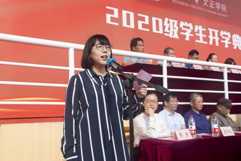 汉语言文学专业负责人茆萌作为教师代表发言。她表示“欲成学问”,应“先就品行”,希望新生敬重师友、关怀现实,求知求实之外,还须适当运动、积极培养兴趣爱好,做一个健康快乐的人。