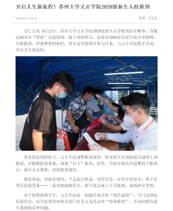 交汇点讯 9月13日,苏州大学文正学院2020级新生入学报到拉开帷幕,首批1100余名“萌新”迈进校园。接下来的两天,还将有2000余名新生按专业错峰、分批报到。怀揣梦想的他们,将在这里挥洒青春与汗水,与文正学院携手共进,开启人生新旅程。