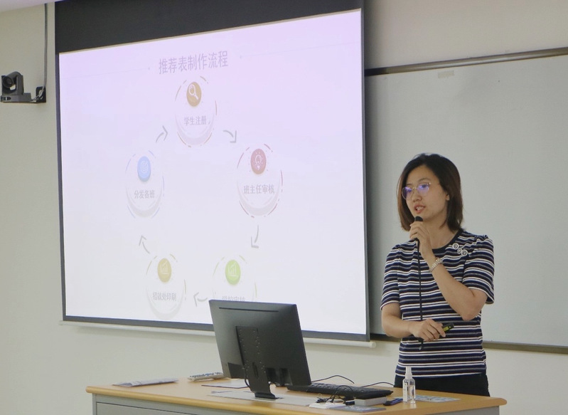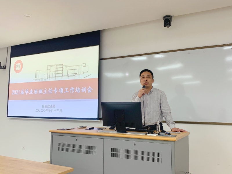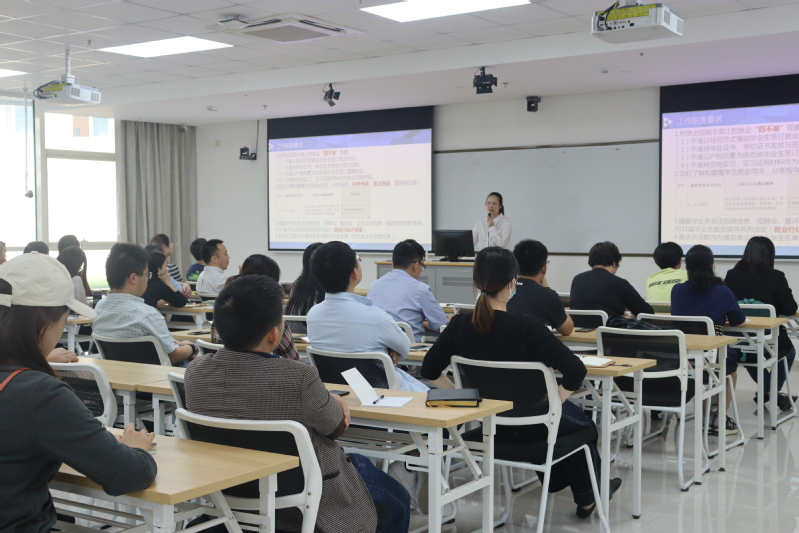 宋丹从工作职责要求、考核条例概要、关键时间节点、相关事项提醒四个方面,对2021届班主任如何开展毕业生就业相关工作进行专题培训。她强调,班主任要提升服务引导意识,建立良好师生关系,坚决杜绝出现就业“四不准”现象,通过多方协作,力求形成合力,共同达成2021届毕业生顺利就业、高质量就业目标。