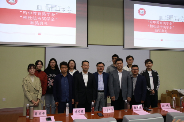 杜洪波、上官丕亮、孙兰镇为“哈中教育奖学金”、“柏杜法考奖学金”获得者颁发证书,并合影留念。