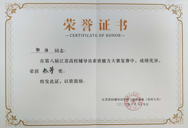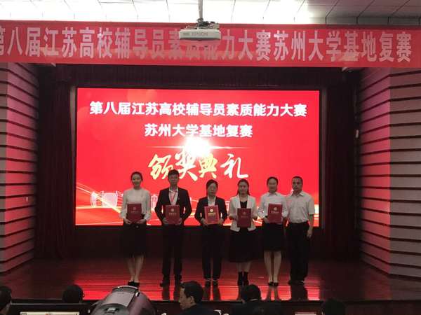 10月27日至29日,由江苏省委教育工委、江苏省教育厅主办,江苏省高等教育学会辅导员工作研究委员会、江苏省高校辅导员培训与研修基地(南京工业大学)承办,江苏省高校辅导员培训与研修基地(苏州大学)协办的“第八届江苏高校辅导员素质能力大赛苏州大学基地复赛”在苏州大学红楼报告厅举行。来自苏州、无锡、常州、南通、泰州等5市20所本科院校的20名辅导员参加了比赛,各参赛高校领队、辅导员代表观摩了比赛。我院学生处郭浩老师荣获大赛三等奖。