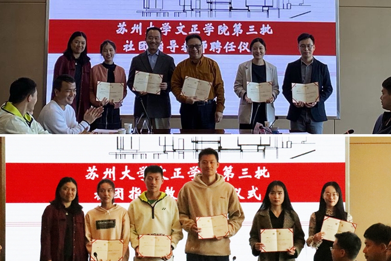 卞海勇宣读学院第三批学生社团指导教师聘任决定。本次聘任的14名专业教师分别来自我院文学与传播系、社会服务系、法政系、外语系、体育教研室、思政教研室、数学教研室以及实验教学中心。他们中既有方鸣、曾志平等在专业领域已有丰硕建树的知名教授,也有唐旋、邓彦康等新近加入文正教师队伍的青年才俊。后续他们将从社团建设规划、社员教育管理、日常活动指导等方面参与对档案社、千与千寻广播剧社、大学生法律咨询援助中心、Shine Rolls炫轮社等十多个社团的指导。随后,施盛威为受聘教师颁发聘书。