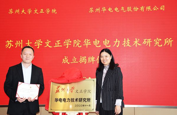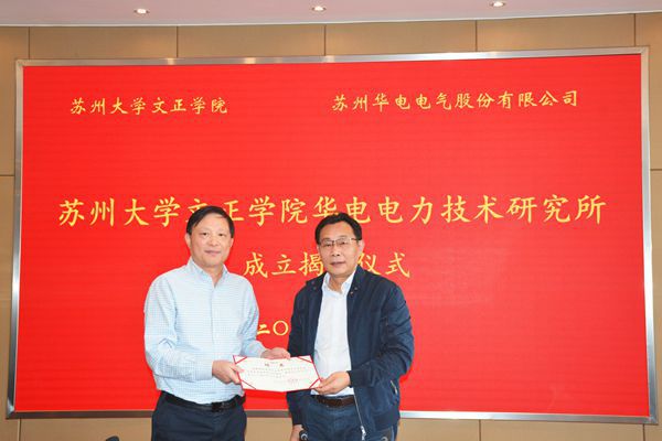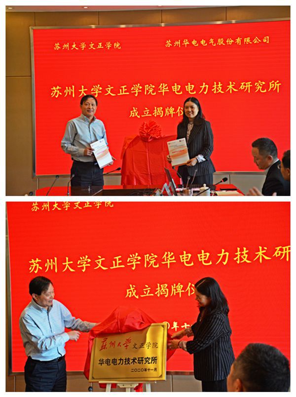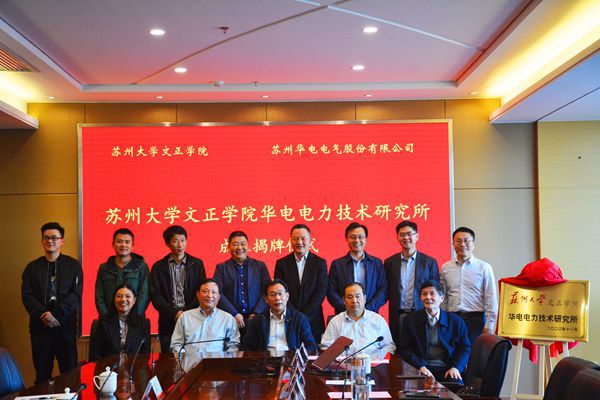 为更好地服务地方经济,促进“政、产、学、研”深入合作,促进学校和企业共同发展,加快科研成果转化为生产力的步伐,提升产业科技创新水平,我院与苏州华电电气股份有限公司(以下简称苏州华电)签订科研平台合作共建协议,成立了我院首个研究所——苏州大学文正学院华电电力技术研究所(以下简称研究所),11月3日研究所成立揭牌仪式在学院成功举行。