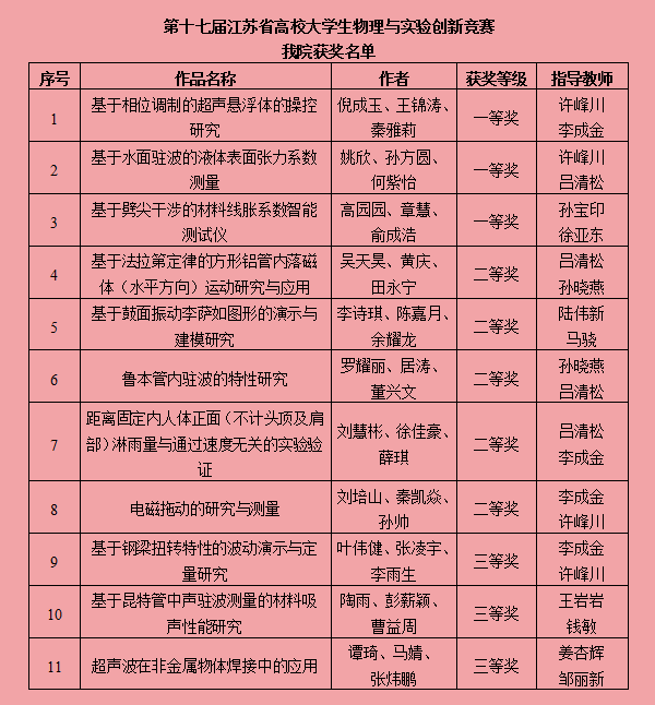近年来,我院在江苏省大学生物理与实验创新竞赛中取得了优异成绩,这充分体现学院在大学生创新实践能力培养方面取得了良好成效。学院将继续秉承培养学生的创新精神与实践能力的理念,不断提升应用型人才的培养质量。