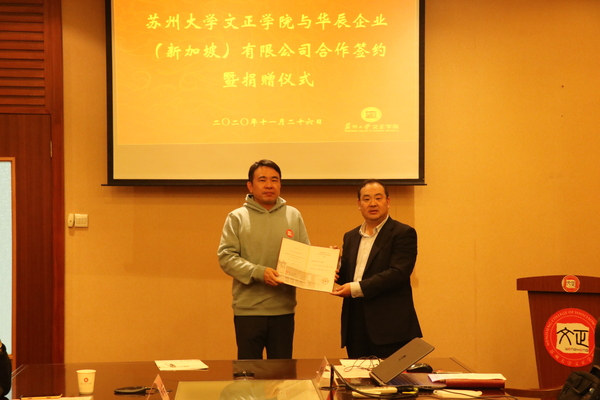 11月26日下午,我院与华辰企业(新加坡)有限公司合作签约暨捐赠仪式在学生活动中心204室顺利举行。华辰企业(新加坡)有限公司董事长刘秉华、副董事长马敬忠等五位来宾,我院党委书记仲宏、副院长朱跃、后勤与资产管理处处长尹维军、艺术系系主任马路等出席仪式。党委办公室副主任陈波主持仪式。