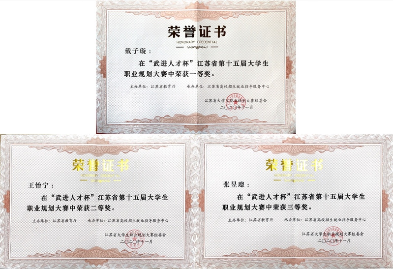 我院历来重视大学生职业生涯规划与指导,招生就业处于今年4月份启动校内赛,12个系科4316名同学踊跃参赛。6月初完成各系科初赛和全院决赛书面作品的评阅环节,评选出10名同学进入全院决赛。经过层层选拔和激烈比拼,选拔出三名选手代表学院参加江苏省复赛,最终戴子璇同学成功晋级江苏省总决赛。在总决赛备赛过程中,招生就业处处长宋丹对参赛选手进行一对一辅导,在书面作品、视频制作以及现场陈述等方面进行悉心指导。最终,我院选派的戴子璇同学在江苏省总决赛中荣获一等奖的好成绩。