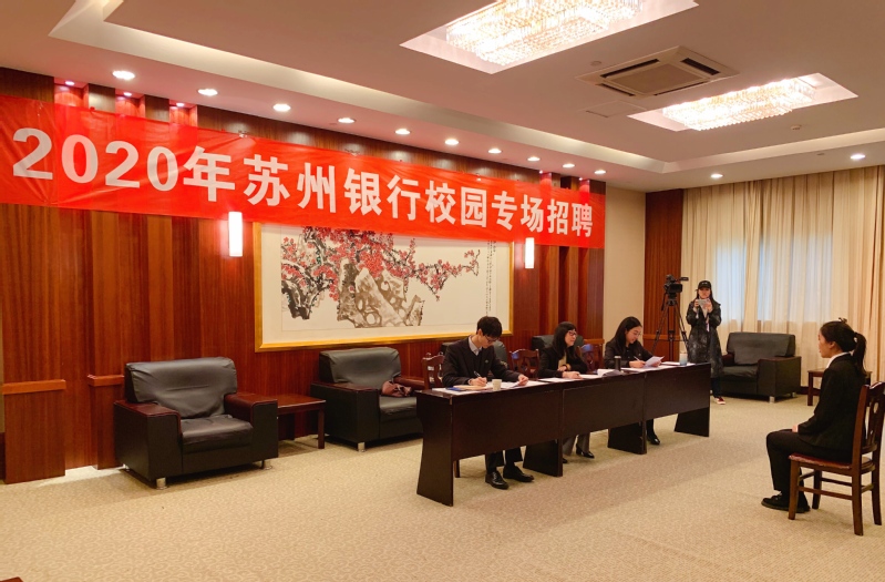 12月2日下午,2020年苏州银行专项人才定制班校园专场招聘在我院学生活动中心203进行。苏州银行苏银金融学院院长樊丽恒、苏州银行总行人力资源部教育培训中心经理徐侃、苏州银行总行人力资源部组织人事中心招聘管理岗陆汇滔担任招聘面试官,我院2020年苏州银行专项人才定制班程娇娇、戴婷婷等30名同学参加此次面试。