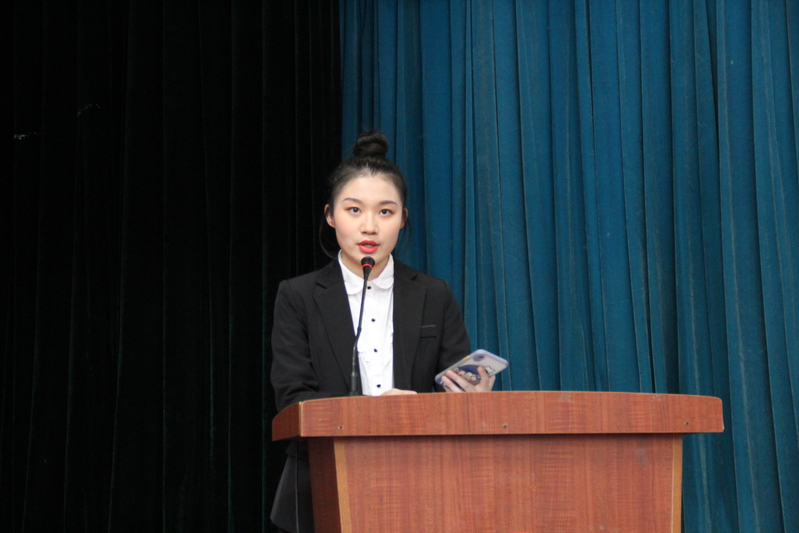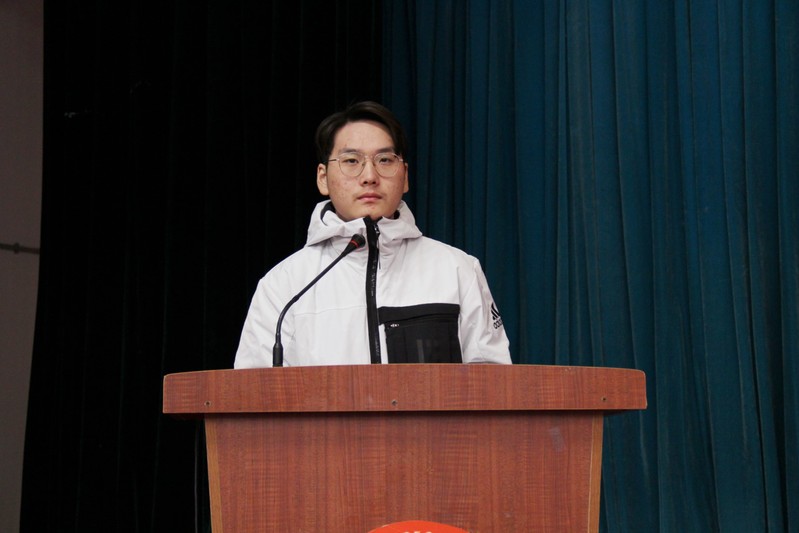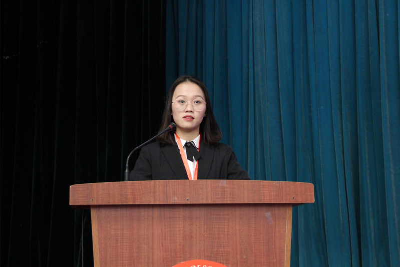 2019级城市管理专业魏凡栋作为先进个人代表上台发言。他分享了自己在红旗普法团的“返家乡”暑期社会实践生活,讲述了其为基层百姓无偿提供法律科普与司法援助的经历。他认为,暑期社会实践的意义在于尽己所能服务社会,实现个人价值与社会价值的统一。