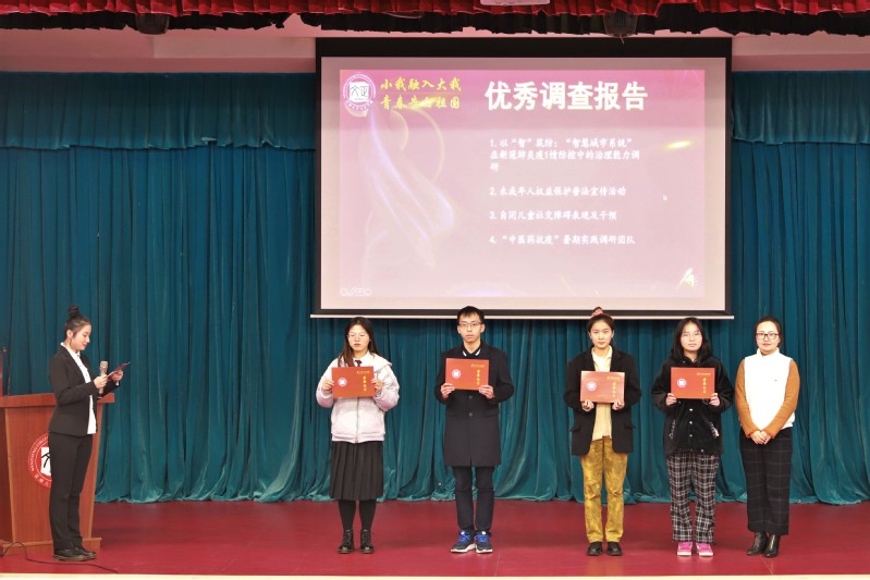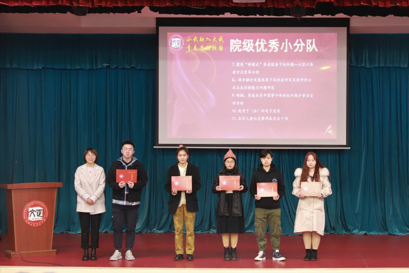 会中,受邀嘉宾祁素萍、何玉、王一分别为院级优秀小分队、优秀调研报告团队和优秀个人颁奖并合影留念。