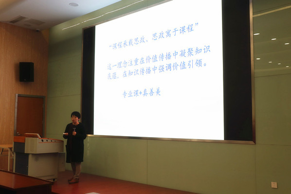 朱蓉蓉围绕“课程思政是什么、怎么做和怎么看”三个方面,深入解读课程思政建设的背景、意义、内涵和价值,辩证分析“课程思政”与“思政课程”的关系,介绍并分享课程建设的具体做法和案例(如会计学、英语等专业的课程)。她指出,课程思政是将思想政治教育的内容和精神融入到所有课程中,构建各类课程与思想政治理论课同向同行、形成协同效应的思想政治理论教育课程体系;课程思政是一个方法,但不是一个加法,课程思政不等同于“课程+思政”,须明确如何贯穿“教书育人”的思想和理念,进而实现立德树人的根本目标。朱蓉蓉着重强调了教师在全面推进课程思政建设中的关键作用:教师是教书育人实施的主体,也是课堂教学的第一责任人,教师须进一步强化育人意识、找准育人角度,提升育人能力,确保课程思政建设落地落实、见功见效。