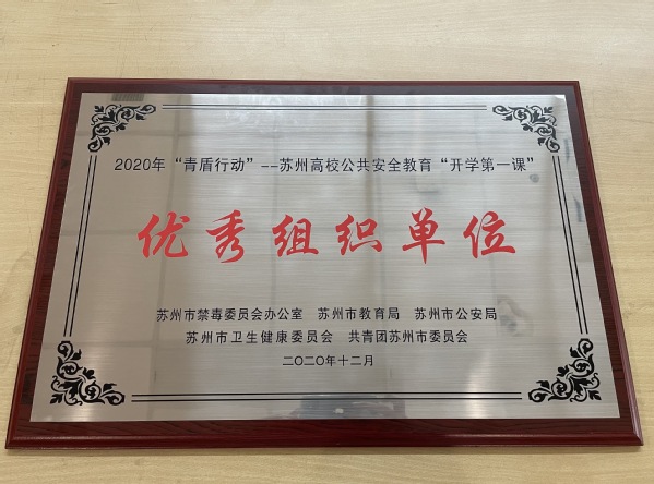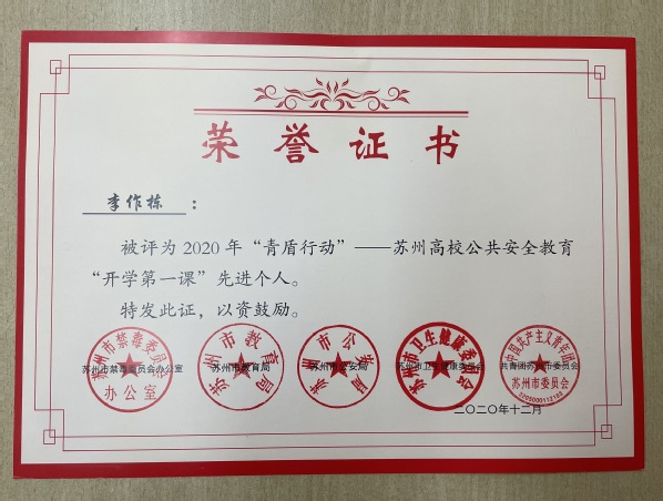 近日,在由苏州市公安局、市教育局、团市委、市卫健委联合指导;市禁毒办,市反通讯网络诈骗中心,市公安局新闻中心、交警支队、网警支队、内保支队,市12355青少年服务中心共同承办的2020年“‘青盾行动’——苏州高校公共安全教育‘开学第一课’”活动中,我院荣获优秀组织单位,我院保卫处李作栋老师获先进个人荣誉称号。