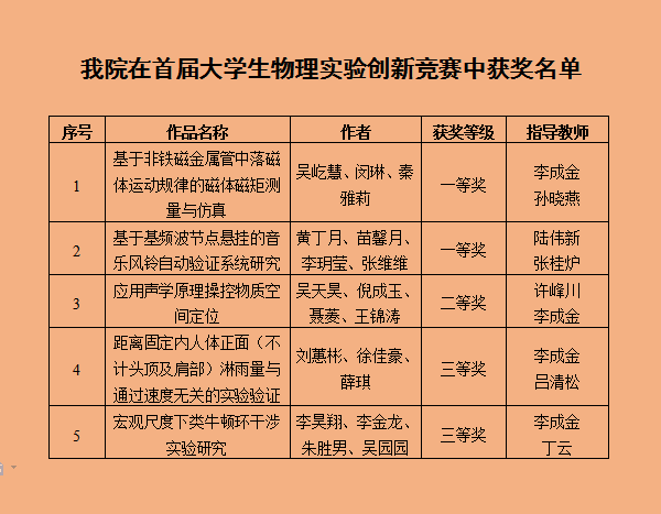 10月-12月,我院选送5支学生团队参加了由东北大学承办的全国首届大学生物理实验创新竞赛,最终有2支队伍斩获一等奖,1支队伍获得二等奖,2支队伍获得三等奖,5名指导教师获得优秀指导教师奖,学院荣获优秀组织奖。