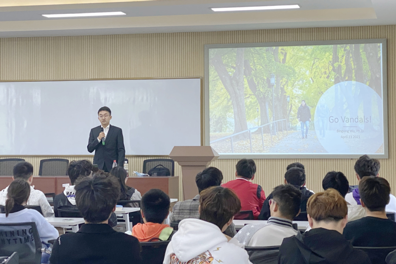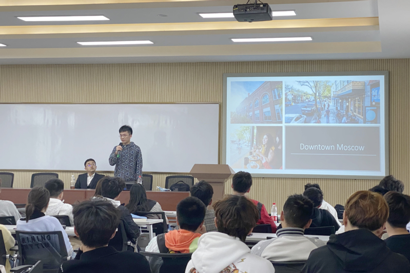 随后,他分别介绍了美国爱达荷大学计算机科学和电气工程专业的基本情况与研究方向,重点谈到了学生应如何适应外方教师的上课模式,并从中积累资源、拓展项目,为就业打好基础。