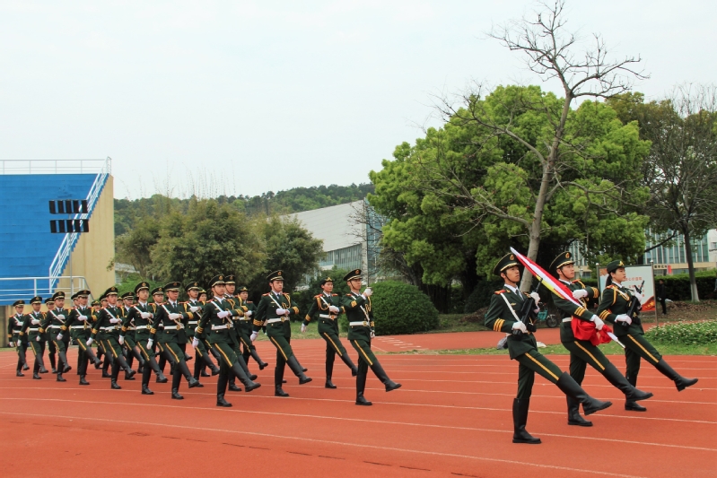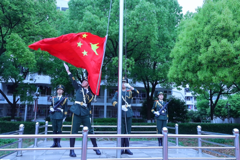 国旗护卫队步伐整齐、口号嘹亮走向旗杆。伴随着高亢的国歌声,五星红旗缓缓升起,全体师生行注目礼。