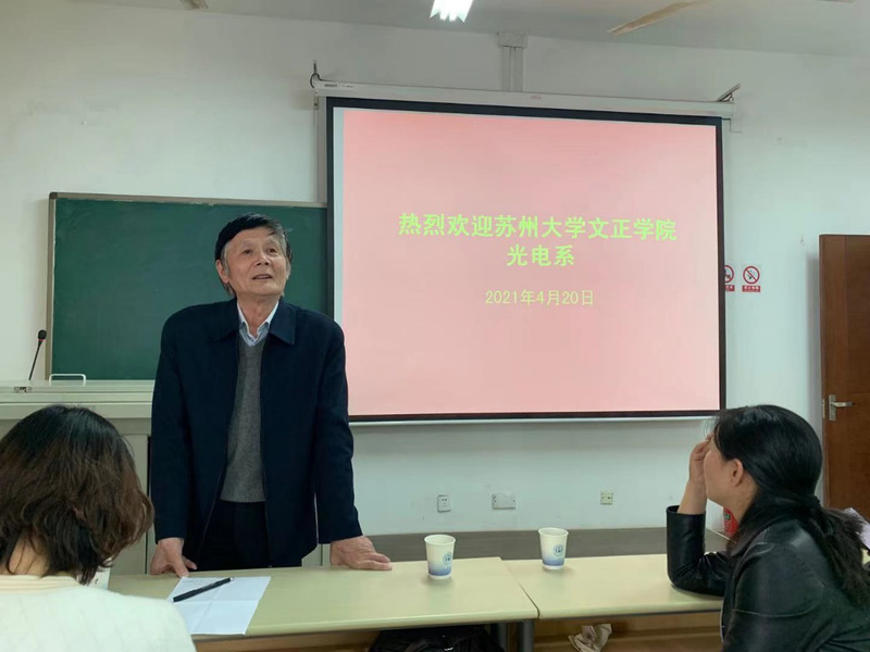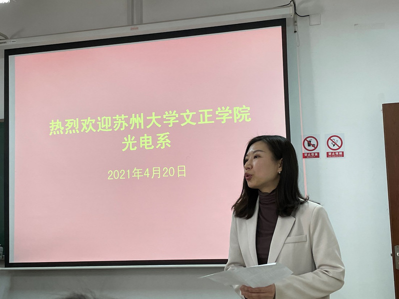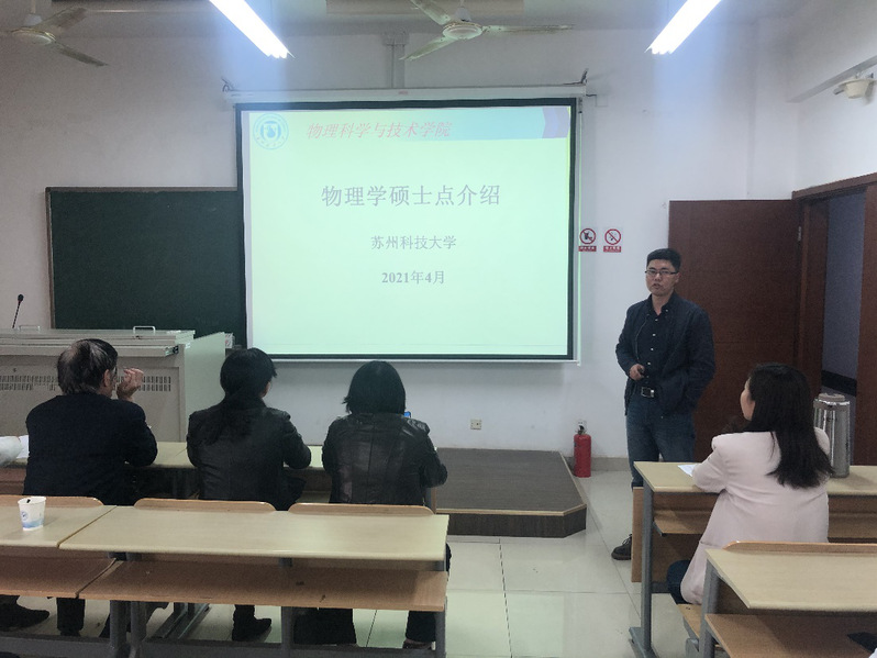 会上,苏州科技大学物理科学与技术学院副院长郝翔从学科平台资源、师资力量、人才培养、科研成果以及研究生录取情况等方面对光学工程学科和物理学科作了详细的介绍。他表示,非常感谢多年来我院对苏科大物理学院硕士研究生培养点建设的大力支持。他表示,进入苏科大进行研究生阶段学习的我院学生都非常优秀,期盼光电与能源工程系的学生能够更加积极地报考苏科大物理学院的硕士研究生。