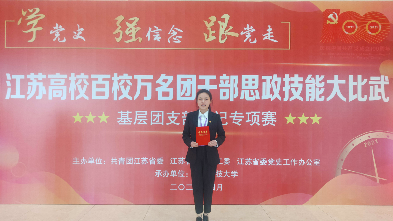 4月25日,“学党史、强信念、跟党走”江苏高校百校万名团干部思政技能大比武基层团支部书记专项赛总决赛在江苏科技大学举行,我院工商系19会计1班团支部书记秦洁荣获三等奖。