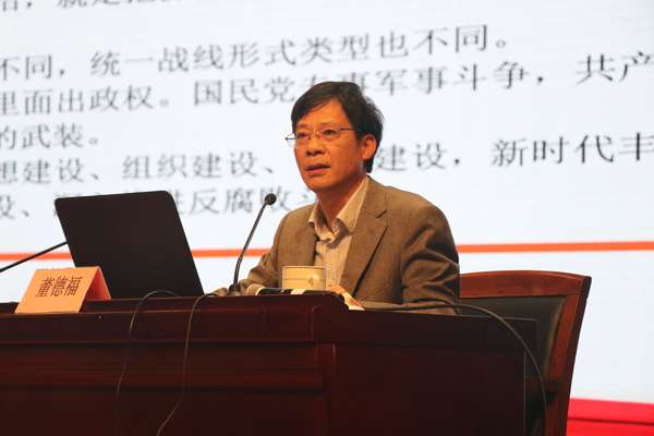 董德福以《从百年党史中汲取前行的智慧和力量》为题,以习近平总书记在党史学习教育动员大会上提出的“学史明理、学史增信、学史崇德、学史力行”为要求,从四个方面强调全体师生党员要以正确的党史观学习党史。他回顾了中国共产党百年奋斗的光辉历程和历史性贡献,深入阐述了党史学习教育的重要意义,从“三大法宝”、科学理论的指导、鲜明的人民立场、伟大的斗争精神和鲜明的自我革命精神等五个方面解读了百年大党的成功“密码”。