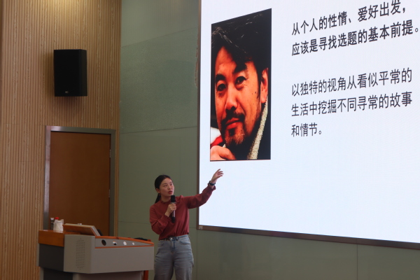 赫金芳首先结合Vlog、短视频、微电影以及微纪录片的内容与区别阐述了“短视频”的概念,并结合本次短视频制作大赛《我爱我的祖国》、《这就是苏州》、《青春在路上》等主题,对开拓创作思路提出指导意见和建议。接着,她分别从寻找选题的有效途径、策划文案与拍摄大纲、纪实拍摄的基本技能以及搭建结构与剪辑语法四个层面具体讲述了纪录片创作流程。讲座中,她引导同学们从关注身边的人、事、物和特定的行业或场所出发进行创作。同时她强调:一部优秀纪录片需要时间的沉淀才能造就,制作过程中需要与被摄对象进行详细沟通,做好制作预算等。