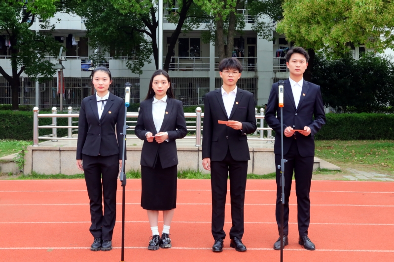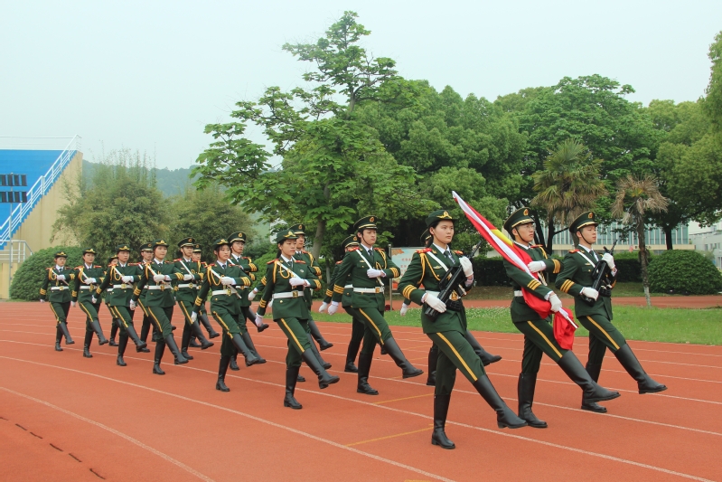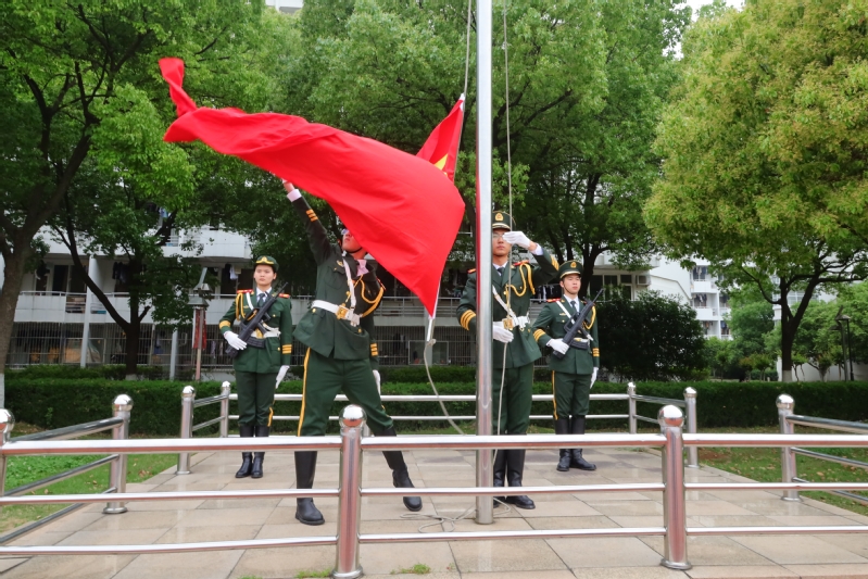 国旗护卫队步伐铿锵、口号嘹亮走向旗杆。伴随着激昂的国歌声,五星红旗冉冉升起,全体师生庄严肃穆,行注目礼。
