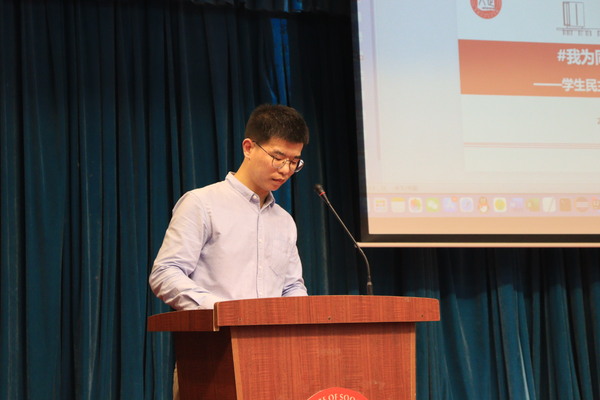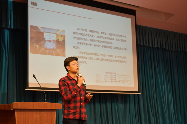 郭浩介绍学生会#我为同学做件事#——学生民主管理工作开展情况。他结合学生会组织改革情况介绍了#我为同学做件事#活动开展背景,指出学生会组织聚焦全心全意服务同学主责主业,在党的领导和团的指导下,服务同学成长成才。同时,他介绍了学生民主管理工作开展方法、学生参与学生民主管理途径等,并号召全体班长、团支书一起行动起来,为同学做件事,服务学生成长。
