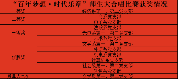 参加本次合唱比赛的队伍以系科党支部为单位。十二支队伍通过深情的合唱表达了对祖国、对党的热爱。其中,电子系的《百年留声》通过四个不同篇章,表达了新时代青年对党的百年历程的祝福;经济系的《少年》别出心裁地把课桌搬上舞台,淋漓尽致地展现了少年们美好的青春热血;社会服务系的《国际歌》慷慨激昂,“国际悲歌歌一曲,狂飙为我从天落”,让同学们收获了对革命理想信念的深刻感受;法政系的《国家》通过手语动作丰富爱国主题,展现出祖国的繁荣昌盛、国富民安。比赛在艺术团合唱团带来的《迎风飘扬的旗》中进入尾声,带领在场同学重温了吾辈定发奋图强的铮铮誓言。
