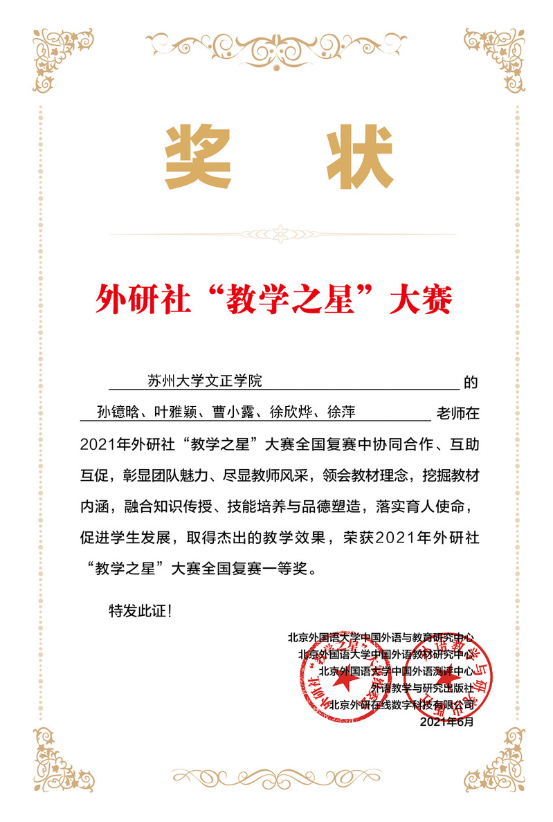 近日,2021年外研社“教学之星”大赛结果公布,经过校级初赛、省级决赛以及全国复赛,我院外语系教学团队获江苏省二等奖、全国复赛一等奖。