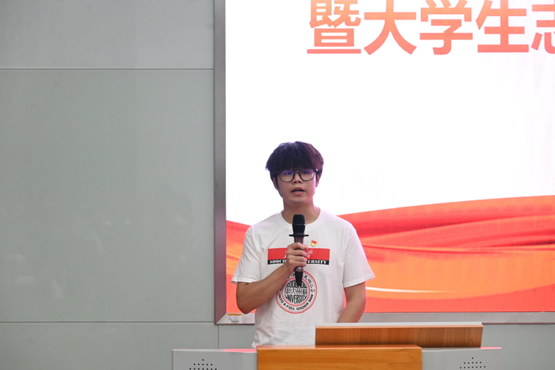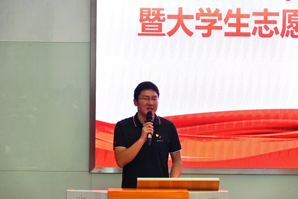 作为我院今年大学生志愿服务西部计划、苏北计划拟录取的代表,2017级汉语言专业的孙建威进行发言。他表示选择了西部计划,就是要将国家命运与个人前途紧密结合,把国家建设的目标和发展的需要变成自己肩上的使命责任,为实现中华民族伟大复兴的接力跑中贡献自己的一份力量。