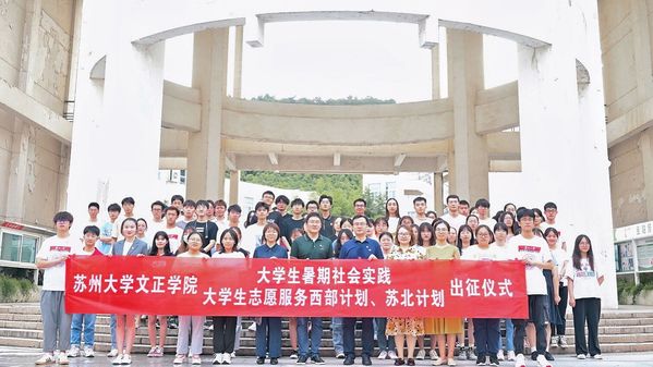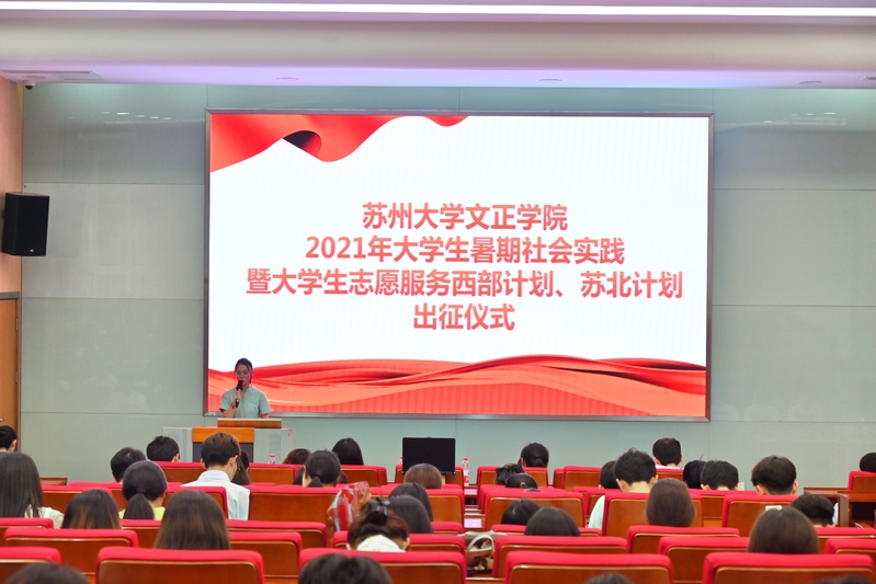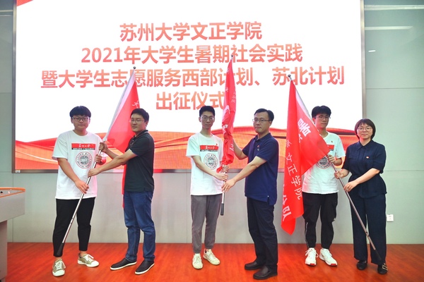 7月6日晚,我院2021年大学生暑期社会实践暨大学生志愿服务西部计划、苏北计划出征仪式在3-101拉开帷幕。苏州大学团委副书记谢凯,我院院长助理、学生工作部部长(兼)卞海勇,学生处处长祁素萍,学生处处长助理、团委书记何玉出席仪式。