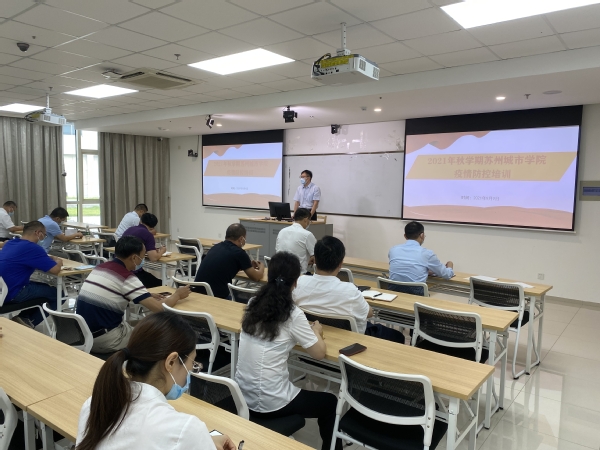为更好的做好我校疫情防控工作,充分做好2021年秋学期学生返校准备工作,进一步强化后勤服务人员疫情安全防控意识,保障平安有序开学。9月9日上午,我校后勤与资产管理处组织部门工作人员、绿升物业、奥臣物业、乐和餐饮、武汉华工、苏州教服餐饮等服务单位各部门管理人员在综合楼122集中学习《2021年江苏高校疫情防控培训》专项知识。