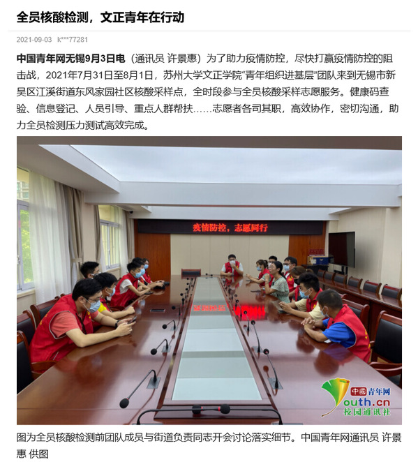 9月3日电(通讯员 许景惠)为了助力疫情防控,尽快打赢疫情防控的阻击战,2021年7月31日至8月1日,苏州大学文正学院“青年组织进基层”团队来到无锡市新吴区江溪街道东风家园社区核酸采样点,全时段参与全员核酸采样志愿服务。健康码查验、信息登记、人员引导、重点人群帮扶……志愿者各司其职,高效协作,密切沟通,助力全员检测压力测试高效完成。