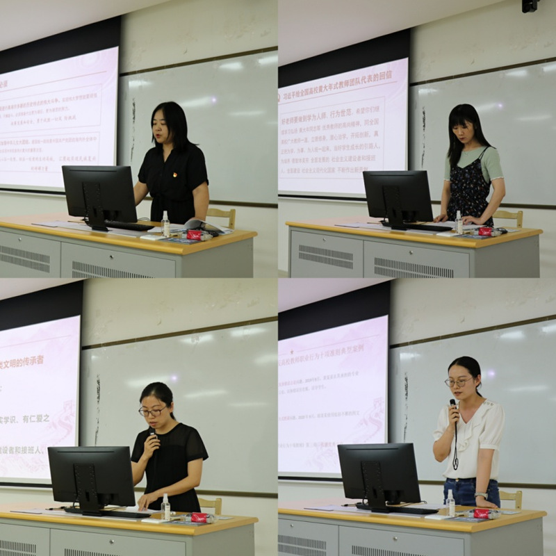 本次学习采用部门代表领学方式进行。教务处沈瑛领学了习近平总书记在庆祝中国共产党成立100周年大会上的重要讲话精神;图书馆徐洁领学了习近平总书记教师节重要讲话、寄语和回信精神;实验与实习管理中心彭芳和沈桓羽分别领学了《新时代高校教师职业行为十项准则》以及教育部公开曝光的违反高校教师职业行为十项准则典型案例。