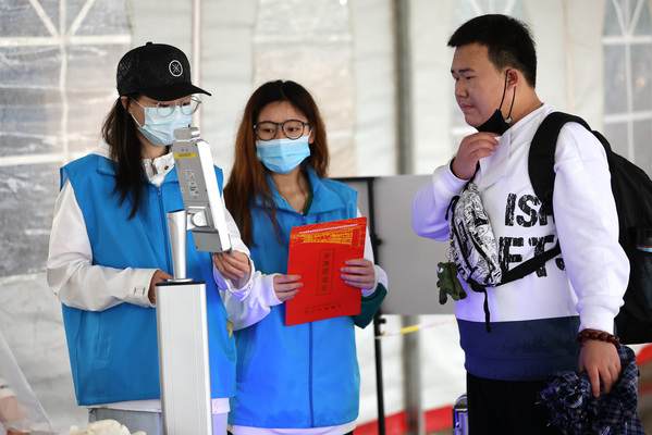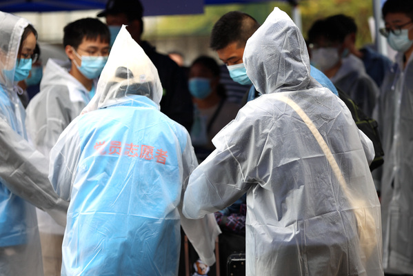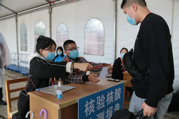 整个迎新现场秩序井然,新生按照相关指引有序报到。新生报到时需检测体温,查询健康码、个人旅行轨迹及登车(机)前 48 小时内核酸检测阴性证明,核对与检测无误后学生本人携带《新生录取通知书》和二代身份证进校,进行核酸采样后继续接下来的报到流程。
