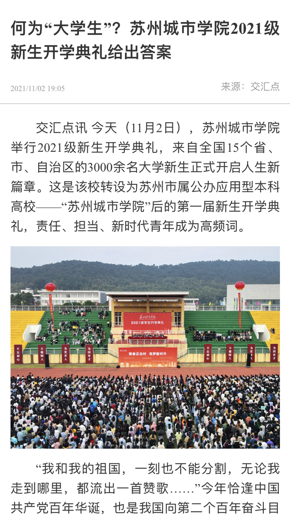 交汇点讯 今天(11月2日),苏州城市学院举行2021级新生开学典礼,来自全国15个省、市、自治区的3000余名大学新生正式开启人生新篇章。这是该校转设为苏州市属公办应用型本科高校——“苏州城市学院”后的第一届新生开学典礼,责任、担当、新时代青年成为高频词。